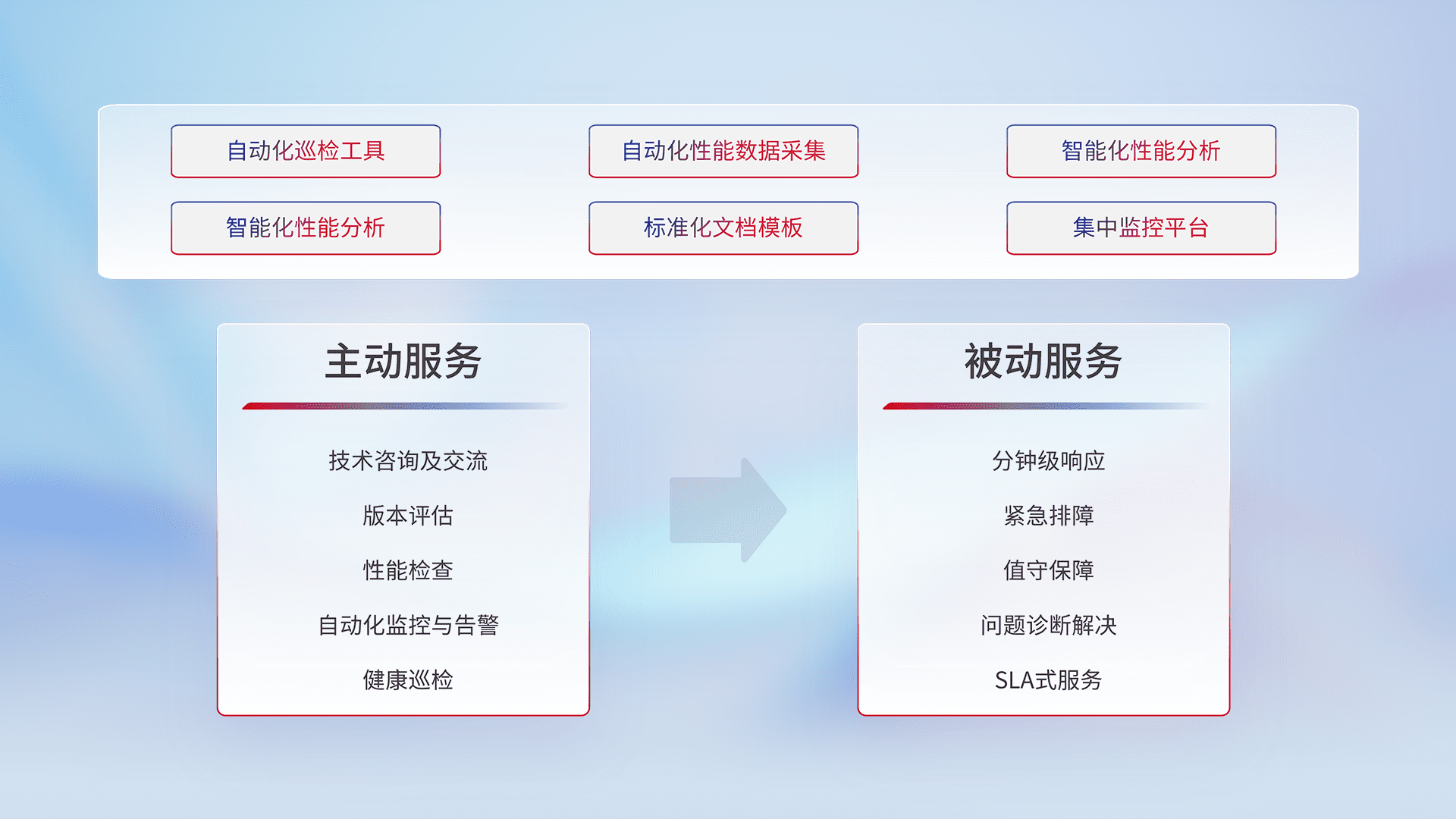 智能化工具和标准化文档,,,,保障服务质量,,提供主动服务(包含技术咨询、、、、版本评估、、性能检查、、、自动化监控与告警、、健康巡检)和被动服务包含(分钟级响应、、、紧急排障、、值守保障、、、、问题诊断解决、、、SLA服务)。。。。