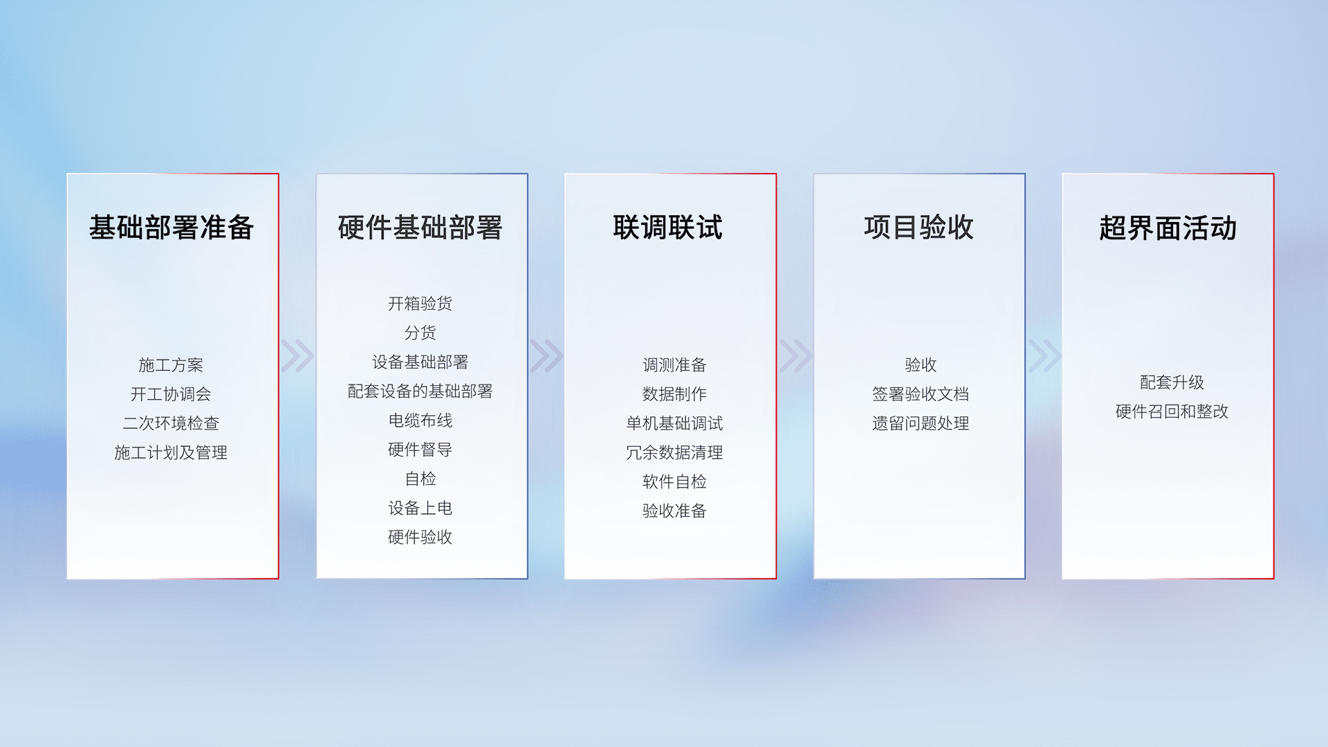 从基础部署准备、、硬件基础部署、、、联调联试、、、、项目验收、、、、越界面活动的全过程可追溯,,,,保证施工质量和进度。。。